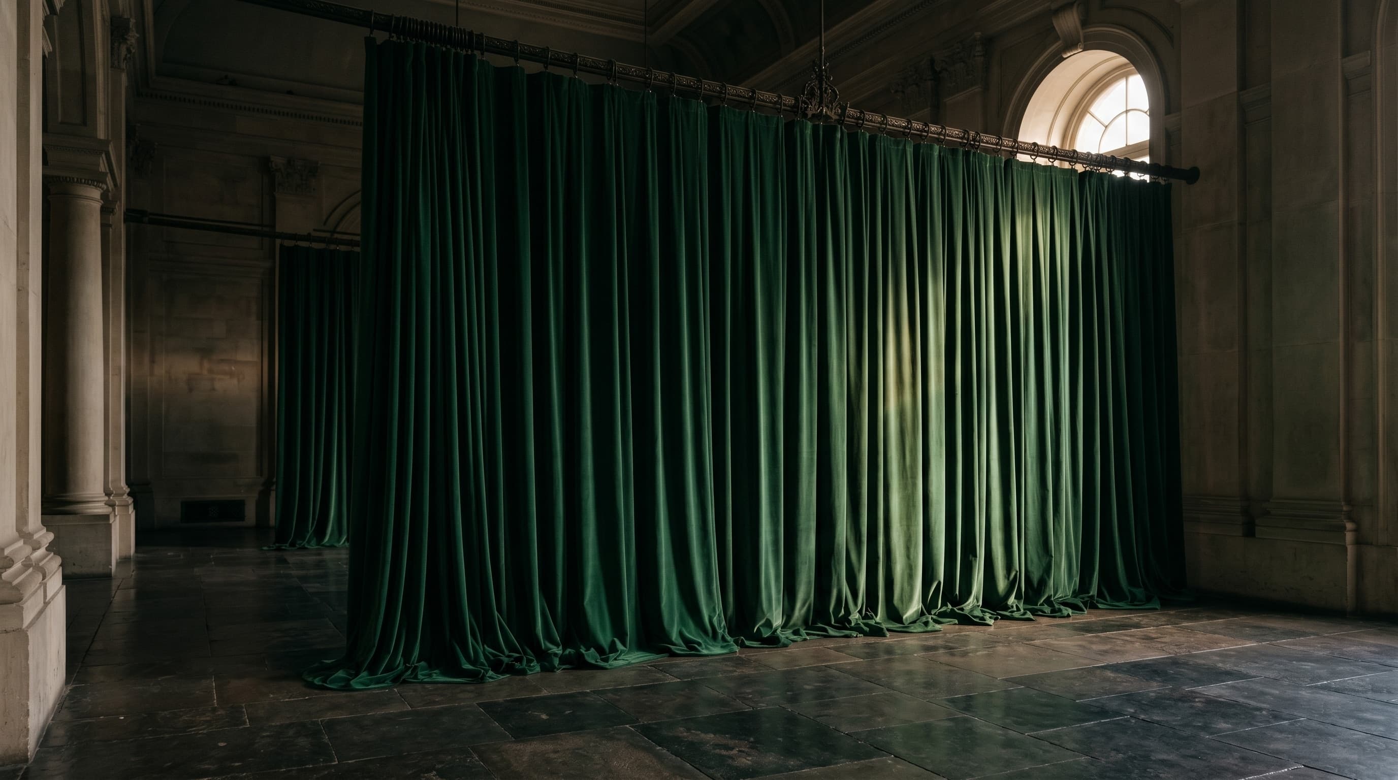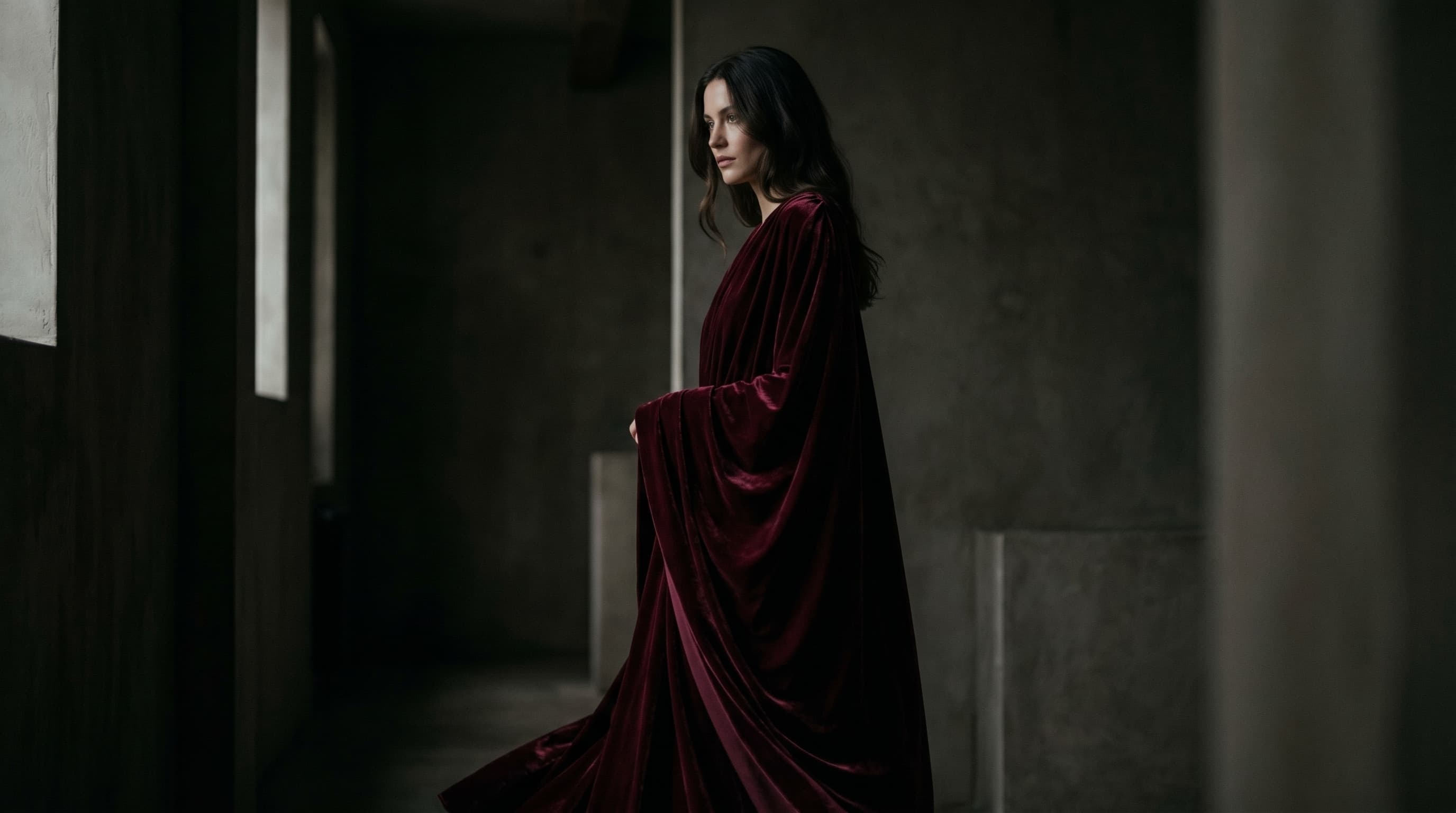 Cotton velvet woven with a tall pile. Substantial weight, architectural drape, absolute chromatic absorption.